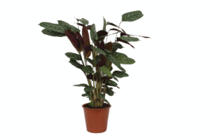 - De Calathea Medallion heeft grote, ronde bladeren met een prachtig patroon van donkergroen en lichtgroen, met een opvallend medaillonvormig ontwerp in het midden.