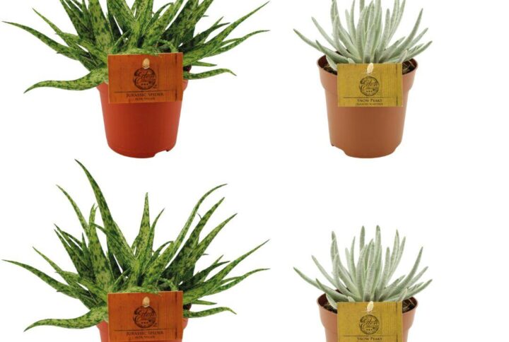 Aussehen der Pflanzen: Aloe Spider: Diese Pflanze hat lange, schmale grüne Blätter, die in einer Rosette wachsen und ein spinnenähnliches Aussehen haben. Die Blätter sind stachelig mit einem hellgrauen Farbton und leuchtend grünen Akzenten. Sedum Tornado: Diese Sukkulente hat eine auffällige, runde Form mit dicken, fleischigen Blättern, die von blau bis blaugrün reichen. Die Blätter haben bei direkter Sonneneinstrahlung einen hellrosa bis roten Rand.